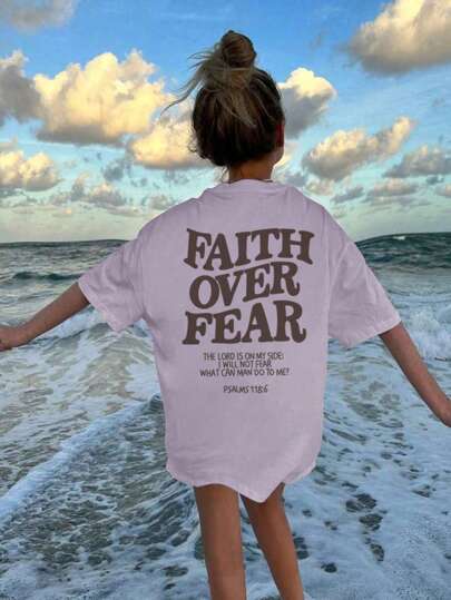 夏季休闲印花圆领短袖T恤,专为女孩和儿童设计——为追求时尚潮流的时尚达人提供独具特色的T恤!女童服装,女童图案T恤,夏季上衣,女童服饰,“信念战胜恐惧” - 紫色 - 查看 4