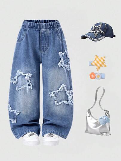 女童休闲简约星雪花印花牛仔裤,舒适日常穿着,春夏新品 - 深色水洗藍 - 查看 6