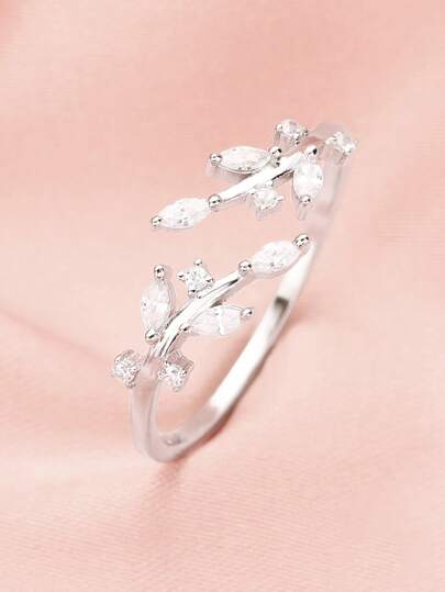 1入組魅力四射方晶鋯石樹葉裝飾銀開口戒指適合女士日常裝飾 - 銀色 - 查看 1