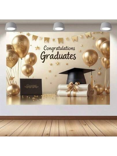 1 件毕业派对背景横幅,涤纶布墙纸,花卉祝贺图案,无需电力,多功能装饰,适用于客厅、卧室、办公室、户外 - 米色 - 查看 1