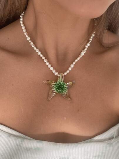 1 件绿色不对称仿珍珠玻璃海星吊坠项链,波西米亚树脂项链,适合女性日常佩戴、约会、夏季郊游、海滩、派对、节日、珠宝礼物 - 彩色 - 查看 1