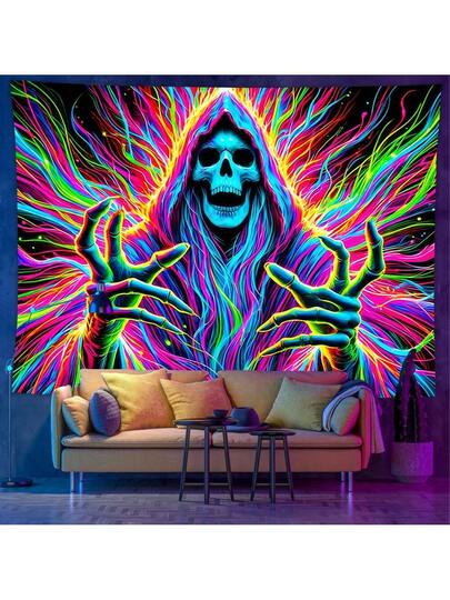 1件HEGO涤纶骷髅挂毯 – UV反应多用途墙饰,无需用电,拉绒面料,适用于家居装饰、节日、派对、婚礼、视频背景、独特艺术品及配件