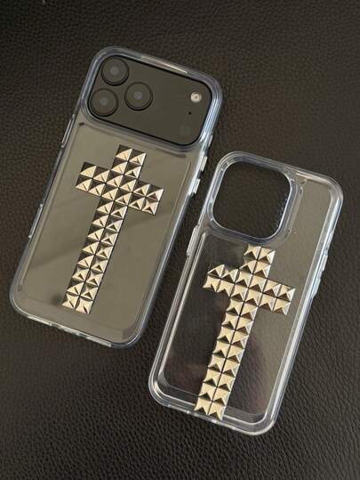 1个万圣节DIY朋克铆钉十字架宗教摇滚铆钉金属皮革手机壳,兼容 17 Pro Max 16 15 14 13 12 11 Pro Max Plus,软后盖 - 無色 - 查看 1