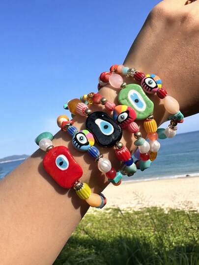 1 件手工波西米亚风彩色玻璃串珠手链,适合女士,夏季海滩旅行波西米亚风珠宝,邪恶之眼设计(颜色和形状各异) - 彩色 - 查看 1
