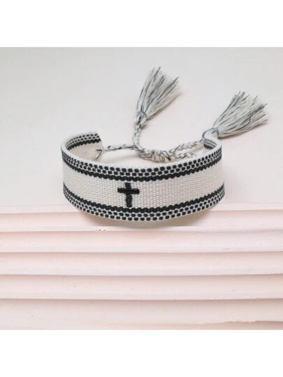 1 件手工刺绣十字波西米亚编织流苏手链 - 黑與白 - 查看 3