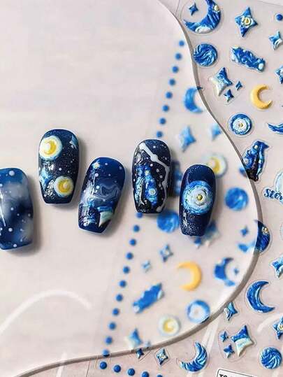 1张印象派星空3D美甲贴纸,美甲师必备,3D浮雕绘画设计,自粘式美甲贴,可重复使用DIY美甲贴纸,女士礼物,美甲用品,优雅配饰礼品