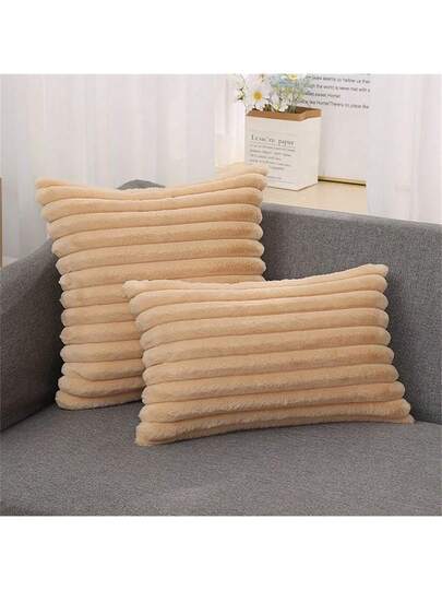 1個卡其色兔毛條紋圖案抱枕套(不含抱枕芯),實心假兔毛蓬鬆坐墊套,適用於沙發坐墊、汽車枕頭、裝飾等,適合冬季保暖 - 卡其色 - 查看 1