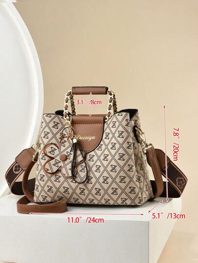 1 件卡其色时尚手提包,压花满花印花,采用 PU 材质,配有花朵吊坠,女士高端迷你手提包,时尚字母图案,别致的单肩包适合各种场合,大容量手提包非常适合日常使用、约会、送礼和旅行,最佳母亲节礼物创意,母亲节礼物,妈妈礼物,妈妈的必需品,外出妈妈包 - 卡其色 - 查看 1