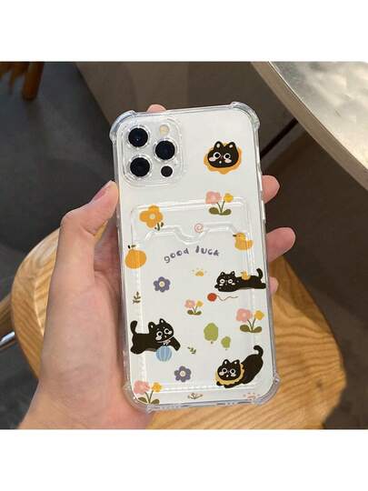 1 件韩式透明卡槽花朵和黑猫设计手机壳适用于 16 Pro Max/15/14/13/12/11,用途广泛 - 彩色 - 查看 1