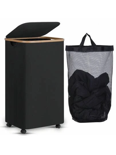 1 个带轮洗衣篮,100 升带盖洗衣篮和可拆卸洗衣袋,防水大号带轮洗衣篮,带竹柄的滚动洗衣篮,适用于洗衣房 - 彩色 - 查看 1