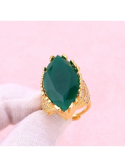 1只豪華情侶開放式設計戒指,尺寸可調,銅金鍍層鑲嵌立方氧化鋯。橄欖形狀的立方氧化鋯新娘戒指 - 綠色 - 查看 1