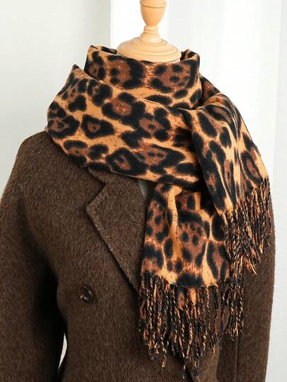 女士奢华豹纹围巾披肩,65*195厘米长围巾,户外防风保暖围脖,新款时尚加厚流苏围巾