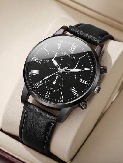 1 件男式皮带休闲运动罗马刻度经典石英腕表,不含表盒 - 黑色 - 查看 1