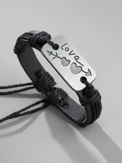 1 件男士時尚簡約 Pu 皮革箭頭心型編織可調式手鍊 - 黑色 - 查看 1