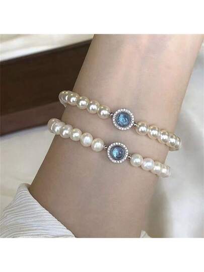 1條美人魚語水星日記海藍色寶石珍珠手鍊,高雅精緻法式女士手環 - 海寶藍珍珠手鍊 - 查看 1