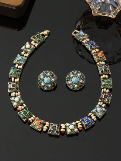 1 条项链和 1 对耳环,波西米亚风格铜合金复古经典珠宝套装,时尚百搭,适合派对,适合节日穿着 - 彩色 - 查看 1