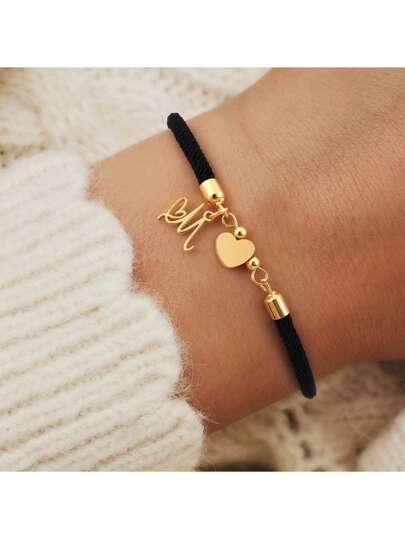 1 件新款经典金色不锈钢首字母心形可调节绳手链 适合女士情人节、妈妈、母亲、母亲节、礼物 - 黑色 - 查看 3