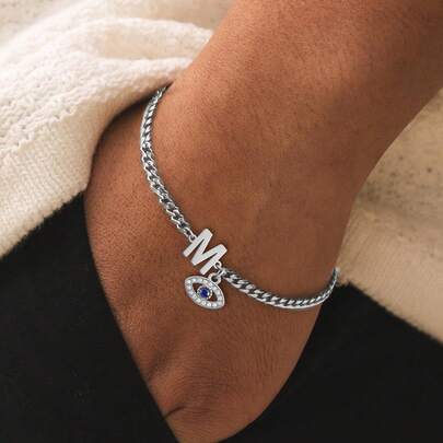 1件新款时尚眼睛字母吊坠银色不锈钢链手链男士 - 銀色 - 查看 1