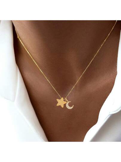 1件新款时尚星星字母密镶锆石月亮吊坠金色不锈钢链项链,女士款