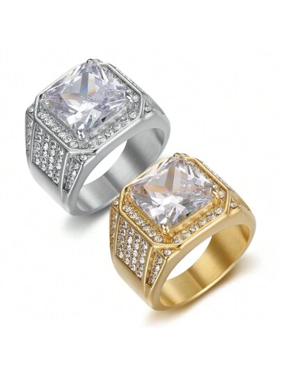 1 件全新奢华 316 不锈钢镀金全镶 3A 锆石嘻哈男式戒指,不锈钢首饰 - 不銹鋼飾品 - 查看 1