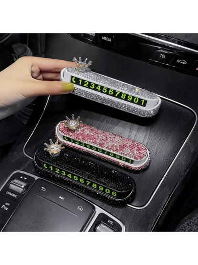 1 件新款仿钻汽车临时停车牌,电话号码牌,时尚女士移动车辆电话号码牌,含号码 - 彩色 - 查看 1