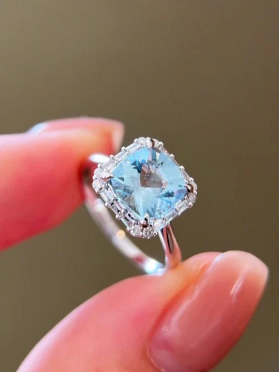 1入組原創時尚Ins風格方形藍色立方氧化鋯復古華麗戒指,由S925純銀製成,適合女性日常佩戴、節日及派對 - 銀色 - 查看 1