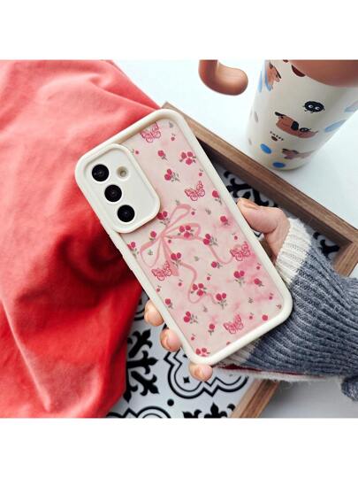 1 件粉色 Ditsy 花卉蝴蝶结设计创意可爱卡通软手机壳,带花卉印花,哑光白色镜头框架阶梯式保护,兼容三星/Galaxy/OPPO/VIVO//Honor/Realme 手机,防水防震防摔防刮 - 彩色 - 查看 1