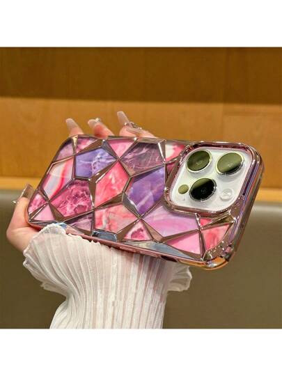 1 件粉色 Imd 電鍍防摔保護殼,帶鑽石網格和大理石設計貼紙,兼容 Iphone - 粉色 - 查看 1