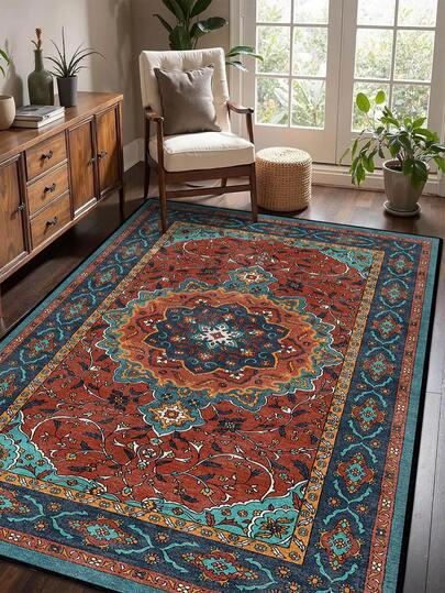 1 件红色复古波西米亚风格地毯,聚酯纤维材质,可机洗,不掉毛,易于打理,家居装饰地毯,适用于客厅沙发、卧室、办公桌、餐厅厨房、床边、玄关、户外露营、房间装饰等区域。 - 彩色 - 查看 9
