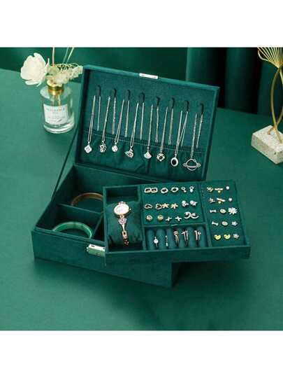 1入復古風格天鵝絨珠寶盒,雙層可鎖存儲盒,適用於項鍊、戒指、手錶、耳環、手鏈等 - 綠色 - 查看 1