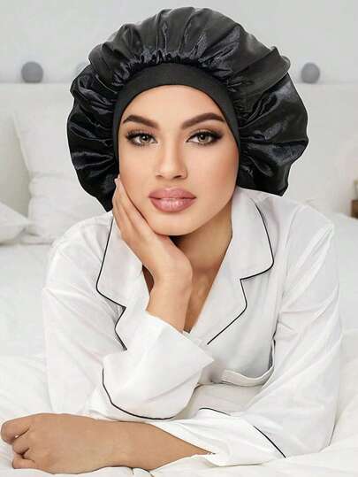 1頂女士用緞面束髮帽,適用於捲曲頭髮和睡眠、女士用緞面束髮帽和大碼辮子束髮帽 - 黑色 - 查看 1