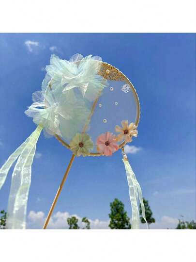 1件装绢花扇子批发蝴蝶纱花丝带多功能汉服洛丽塔手持长柄拍照道具多功能 - 彩色 - 查看 1