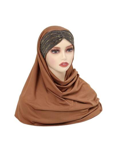 1件純色女士十字頭帶,配有閃亮的亮片,適用於阿拉伯人的多功能帽巾頭巾 - 彩色 - 查看 1