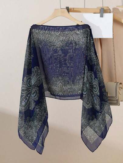 1pc Spring/Summer New Women's Lightweight Chiffon Vintage Botanical Printed Fashionable Loose Pearl Button Shawl Scarf, Head Cover, Sun Protection Clothing, Suitable For Travel And Daily Use Accessories Women