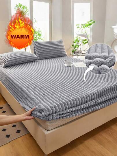 条纹加厚绒床笠套装,柔软舒适,适用于卧室、宿舍、酒店,适用于单人床、双人床、大号床、特大号床,秋冬春季均可使用。