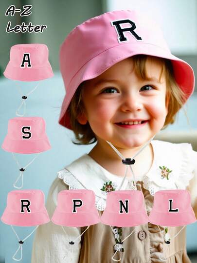1顶幼儿宝宝A-Z字母图案渔夫帽,可调节抽绳,休闲帽,适合男孩女孩旅行、海滩度假 - 粉色 - 查看 1