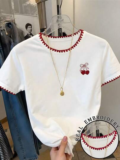 一件少女蝴蝶樱桃图案刺绣领短袖休闲T恤,宽松版型,可爱百搭,适合春夏穿着。