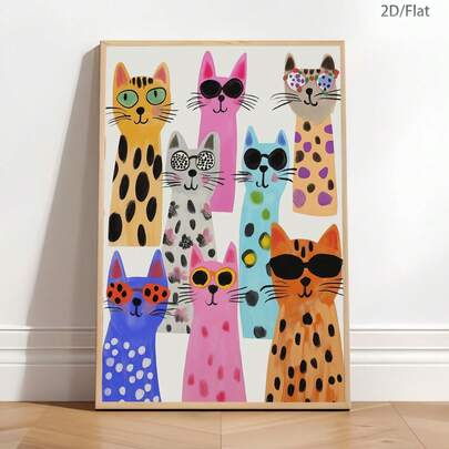 1幅色彩鲜艳、酷炫时尚的猫咪眼镜帆布艺术印刷海报,现代墙面艺术装饰画,时尚有趣的猫咪主题装饰,适用于卧室、客厅、办公室、书房、浴室、厨房、走廊、宿舍、公寓墙面装饰和家居装饰,是送给朋友的理想礼物。