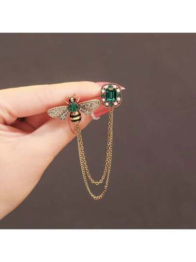 1入復古風蜜蜂流蘇胸針,配鏈&綠寶石細節,適用於西裝外套