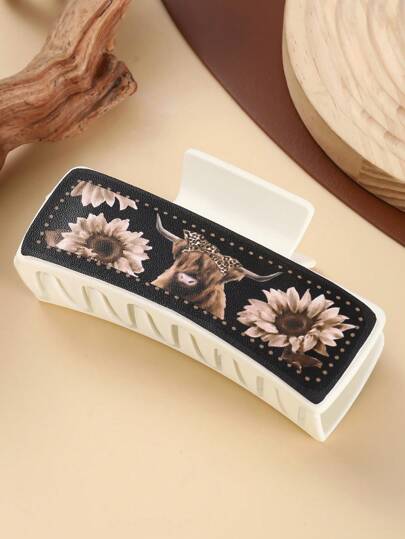 1入復古牛仔風格PU皮革夾髮夾,混合裝飾(夾髮夾,向日葵和牛頭),適合日常穿著、休閒舒適/時尚外觀 - 彩色 - 查看 1