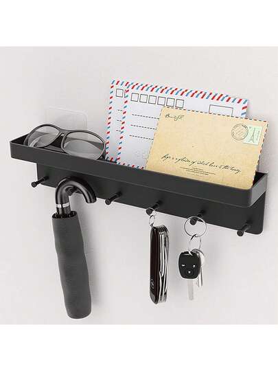 1入掛壁式鑰匙架,帶置物架,掛牆裝飾鑰匙架,6掛勾不銹鋼鑰匙架,掛牆式鑰匙收納架 - 黑色 - 查看 1