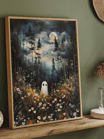 1 件异想天开的万圣节墙画,魔法森林里的幽灵,野花草地帆布海报,魔法森林里的幽灵和黑猫墙画,迷人的恐怖秋季黑暗学院风印刷画,卧室装饰,客厅装饰,办公室装饰 - 彩色 - 查看 1
