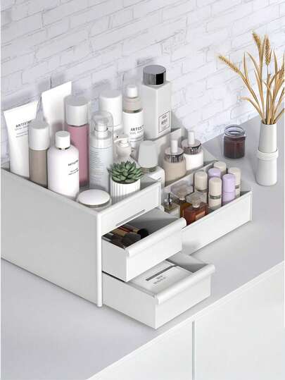 1 件白色抽屉式化妆品收纳盒宿舍桌面整理器梳妆台护肤口红塑料架、美甲收纳盒、护肤品收纳盒、带抽屉的化妆台收纳盒、化妆品台面收纳盒、化妆刷桌面收纳盒,带口红刷、眼影刷和首饰架 - 白色 - 查看 1