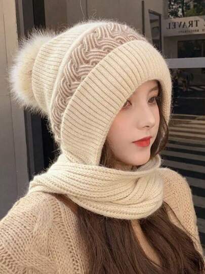 1 件女式冬季滑雪帽圍巾套裝,甜美加厚針織帽圍巾一體化設計,防風保暖 - 米色 - 查看 1