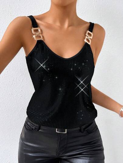 Chiquease 1 件女士金属纹理拼布链条装饰吊带背心 - 黑色 - 查看 1