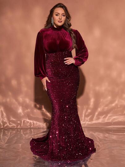 1 件女式加大码圆领长袖亮片拼接超长派对连衣裙,酒红色 - 紅色 - 查看 1