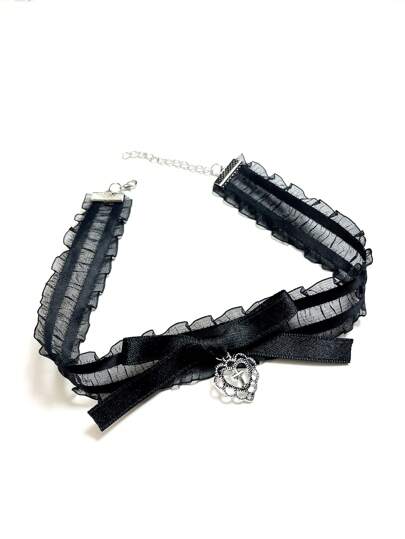 1個女士哥特風格黑色蕾絲頸帶,帶有愛心和吊墜設計,適合派對、攝影、度假旅行等多種場合 - 黑色 - 查看 1
