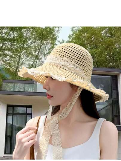 1 件女士宽边草帽,透气蕾丝镂空沙滩遮阳帽,夏季