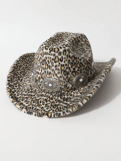 1 件女士秋冬时尚装饰链豹纹仿皮草帽,欧美西部牛仔风格,百搭简约爵士帽,男女通用,适合日常穿着、派对、西部主题活动、聚会、角色扮演、毕业典礼、化妆舞会、节日、生日庆祝、音乐会