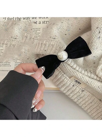 1個女士黑色蝴蝶結&珍珠裝飾天鵝絨邊髮夾,用黑色天鵝絨和白色珍珠材料優雅且高端,適用於休閒場合,可為任何服裝增添溫柔和奢華的風格。 - 黑色 - 查看 1